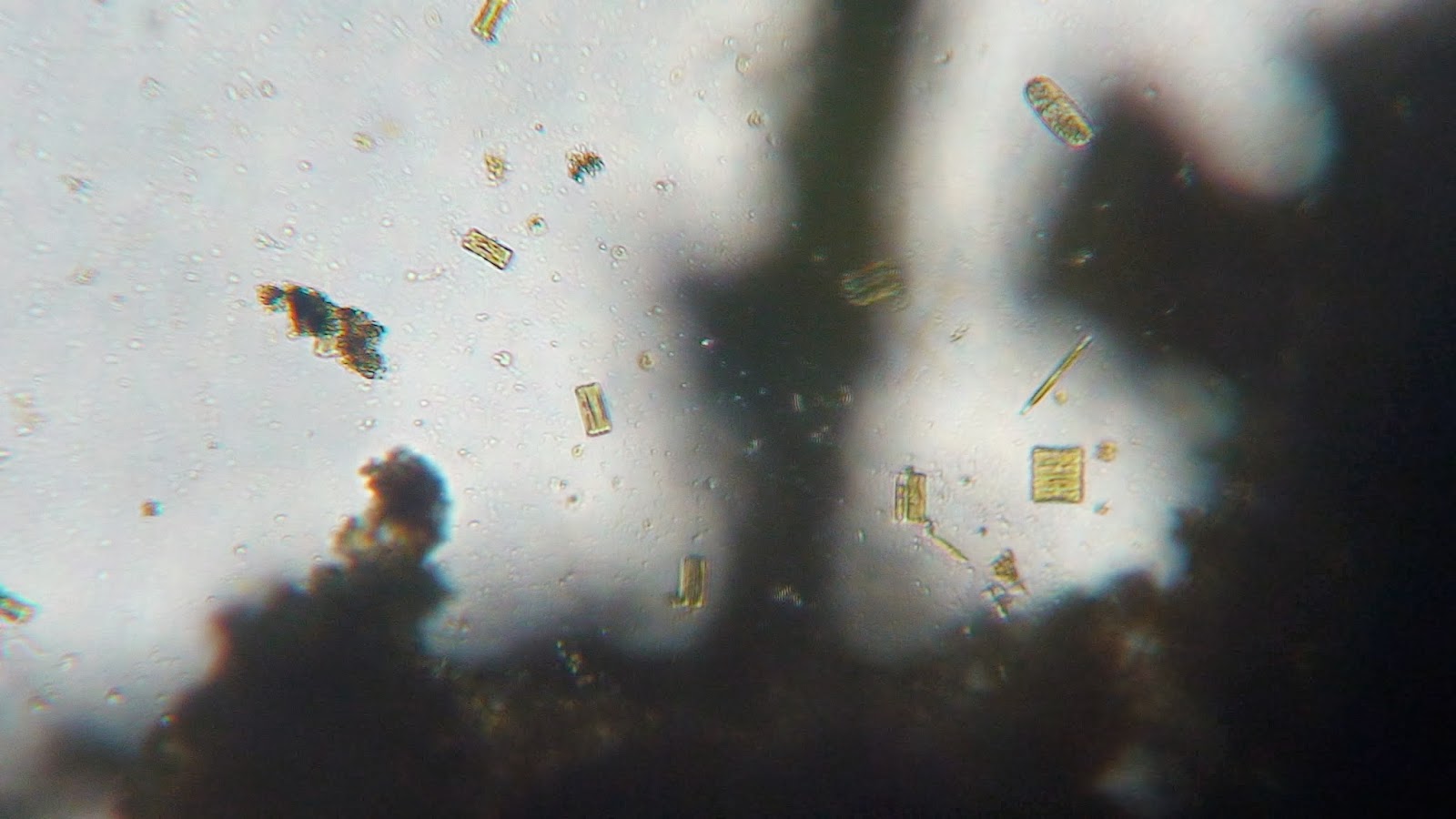 During this final week’s observation, I noticed a decline in the past seemingly abundant amount of bodos. Although the bodos declined, most other life appeared to have increased. This increase came in the form of diatoms of varying type (figure 2,3), many more Cyclopes, more worms (Aeolosoma Ehrenberg) and a newly identified Dero sp. This was identified using the posterior of the organism and is pictured in figure 1 below (Pennak). The part pictured is of the rear end, used to identify it are the clear tentacle like protrusions coming out if the larger green plant mass. The dark linear mass in the middle of the plant mass is the rest of the organism. An increase of life within the soil was noticed, though the organisms were too concealed to identify. The water plants appear healthy and green and still have what appear to be cyanobacteria healthily growing among most of them (figure 4).